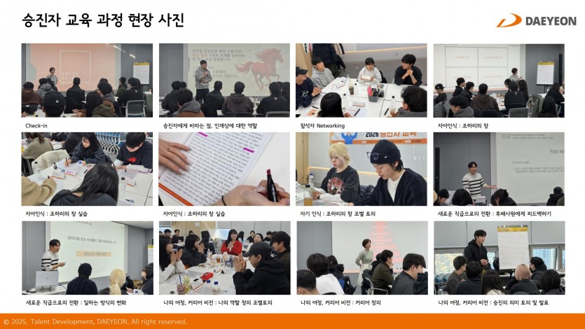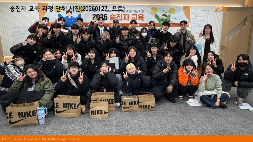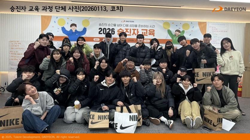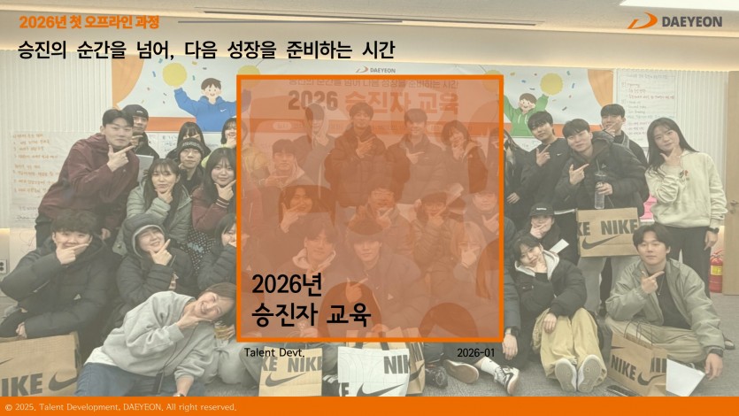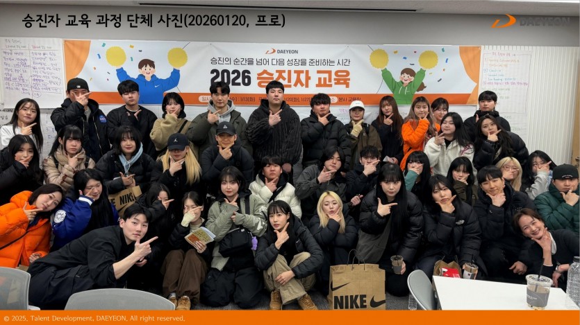 2026년 1월 13일(화), 20(화), 27(화) 2026년 승진자 교육 1. 과정명 : 2026년 승진자 교육2. 과정 개요 : 조직 내 중간관리자의 역할과 태도3. 일시 : 2026년 1월 13일(화), 20(화), 27(화) 총 3차수4. 장소 : 서울지사 교육장5. 과정 사진 목록으로